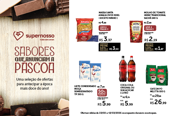 Em nosso folheto, você encontra promoções exclusivas para Belo Horizonte e região, e as melhores ofertas para as nossas lojas físicas. Navegue pelos nossos departamentos de mercearia, padaria, carnes e hortifrúti e garanta refeições com a qualidade que sua família merece. Experimente a praticidade de fazer mercado online conosco e saiba o porquê do Supermercado Supernosso em Belo Horizonte é a escolha de tantos mineiros há mais de duas décadas!