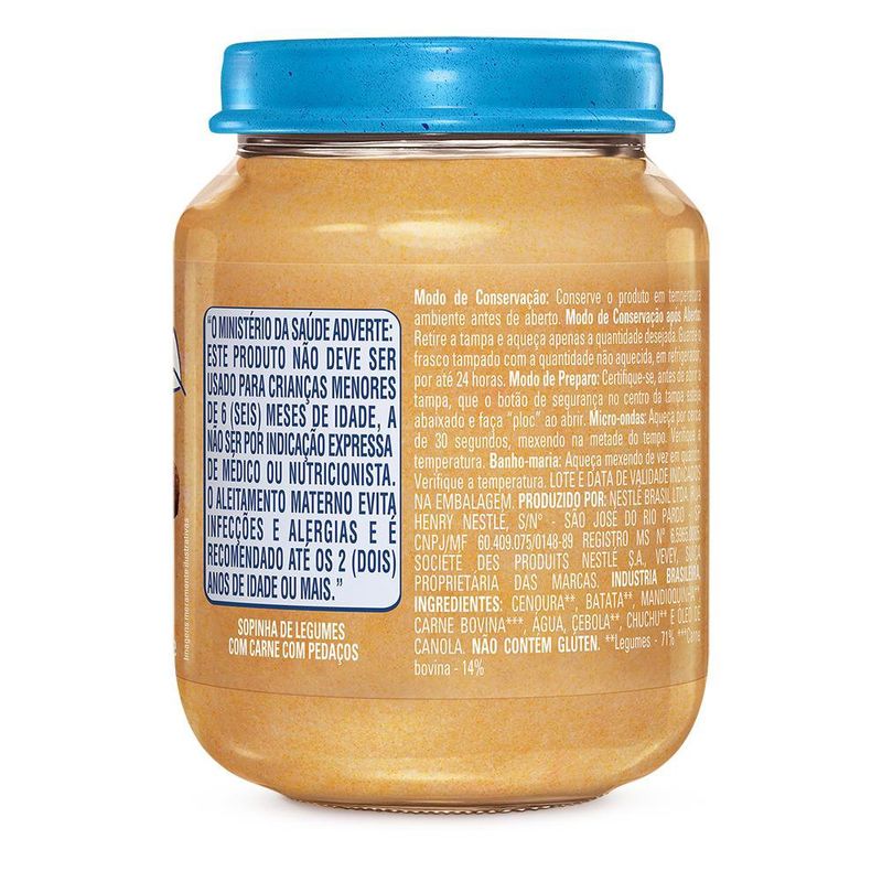 sopinha com pedaços de carne com legumes\n\netapa 3. a partir de 8 meses.\n\ncom menos sal. alimentos com pequenos pedaços estimulam a mastigação.\n\nde que maneira é possível contribuir para o desenvolvimento de hábitos alimentares saudáveis?\noferecer ingredientes variados com sabor e textura adequados para cada fase de desenvolvimento da criança. além disso, com o consumo reduzido de sal é possível proporcionar hábitos alimentares saudáveis.\nnão contém glúten.