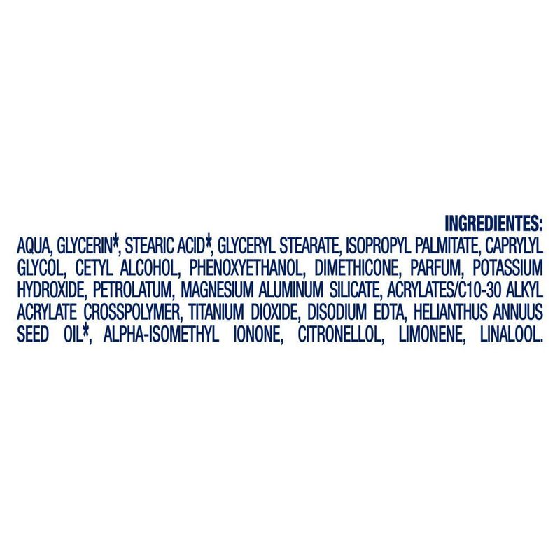 composição: aqua, glycerin, stearic acid, glyceryl stearate, isopropyl palmitate, cetyl alcohol, phenoxyethanol, dimethicone, potassium hydroxide, parfum, petrolatum, acrylates/c10-30 alkyl acrylate crosspolymer, methylparaben, magnesium aluminum silicate, propylparaben, titanium dioxide, disodium edta, sodium pca, potassium lactate, helianthus annuus seed oil, somerized linoleic acid, lactic acid, collagen amino acids, urea, alpha-isomethyl onone, butylphenyl methylpropional, citronellol, limonene, linalool.