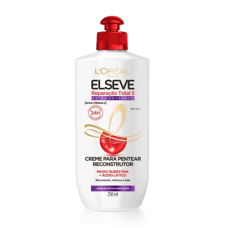 a nova linha elseve reparação total 5+ faz uma reparação total dos 5 sinais de danos para um efeito de plástica capilar. são eles a quebra, a rigidez, a opacidade, o ressecamento e as pontas duplas.