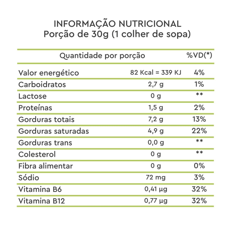 base de castanha (água e castanha-de-caju), óleo de coco palmiste, amido de milho modificado, sal, vitaminas (b6, b9 e b12), extrato de levedura, conservante sorbato de potássio e fermento.