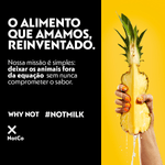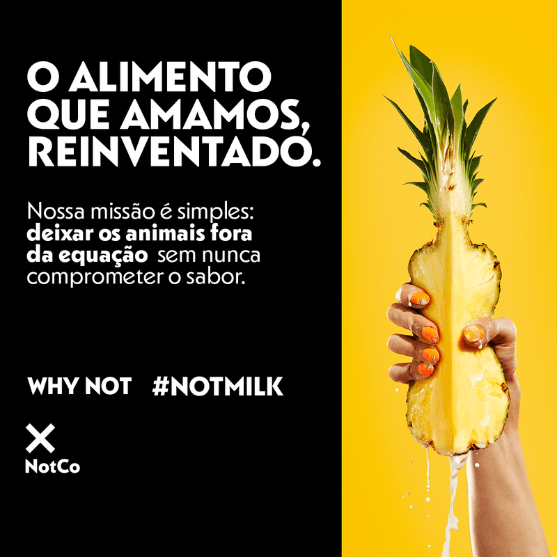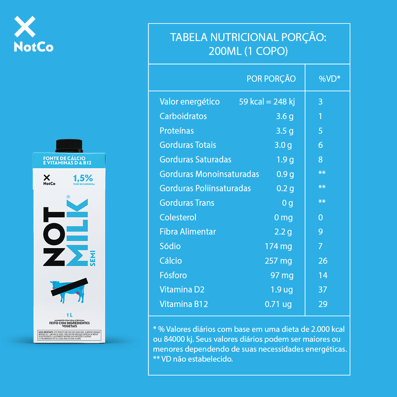 descrição de marketing: not milk é uma bebida vegetal à base de plantas, sem lactose, colesterol, transgênicos e glúten. feito com plantas (e muito carinho).
