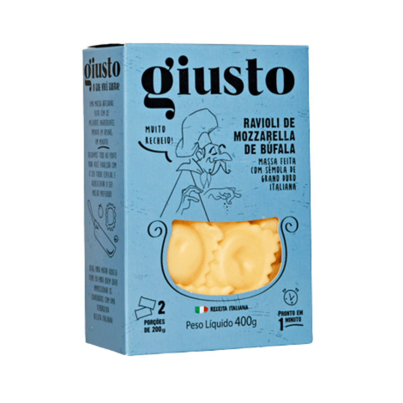 ravioli de mussarela de bufala italiano giusto congelado é uma iguaria genuinamente italiana que oferece aos amantes de comida boa uma experiência incomparável. feito de massa fresca de ovo, recheado com mussarela de búfala italiano saborosa e natural, cada porção contém cerca de 400g e pode ser cozido diretamente do congelador para um prato delicioso.